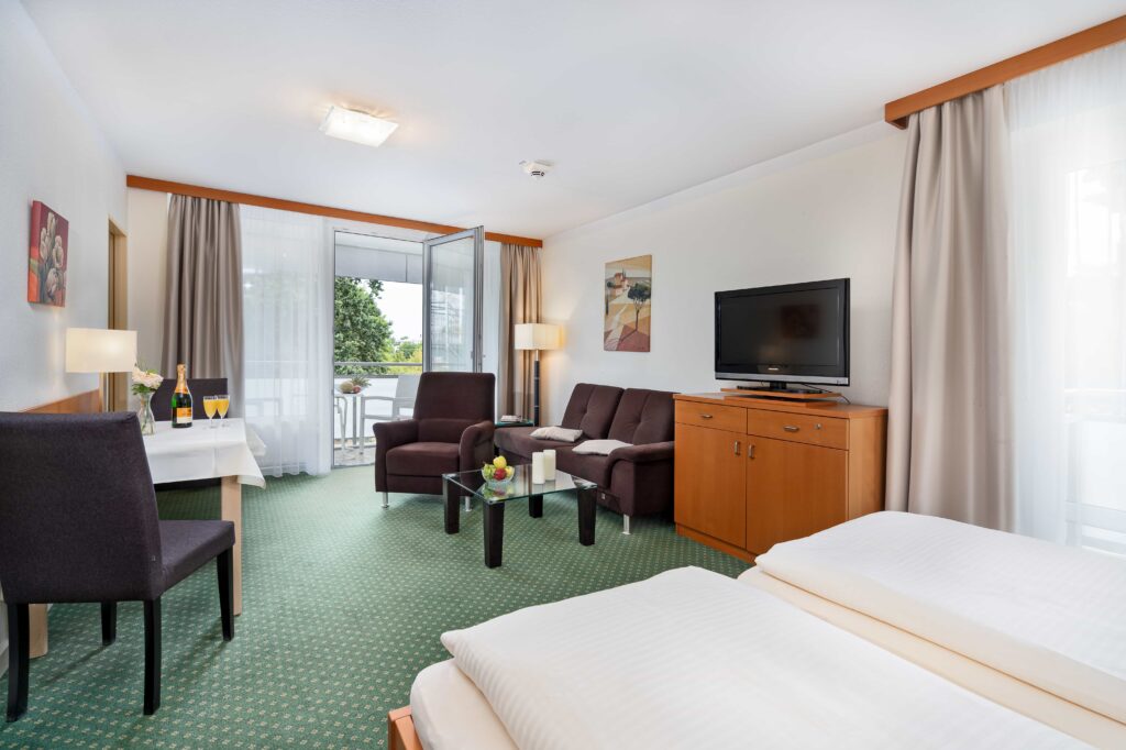 Genießen Sie morgens auf Ihrem eigenen, großzügigen Balkon den ersten Kaffee. Frühstücken Sie jeden Tag mit frischen Croissants, Brötchen oder Brezeln vom Bäcker. Das ist Glück im Herzen von Bad Füssing.