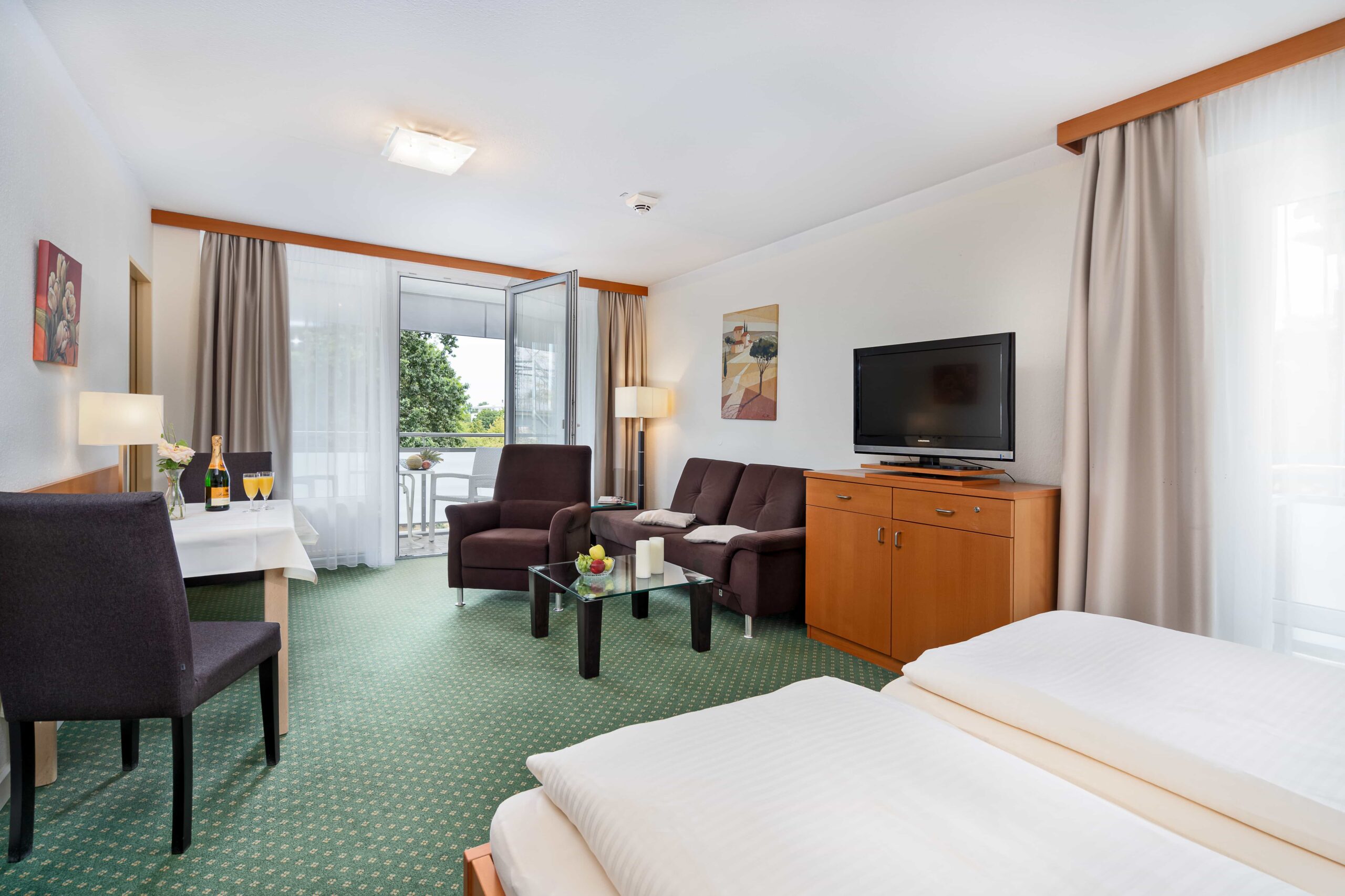 Dieser Appartementtyp beinhaltet ein geräumiges Wohn- und Schlafzimmer mit großem Balkon zur Kurallee und einem Ostbalkon.